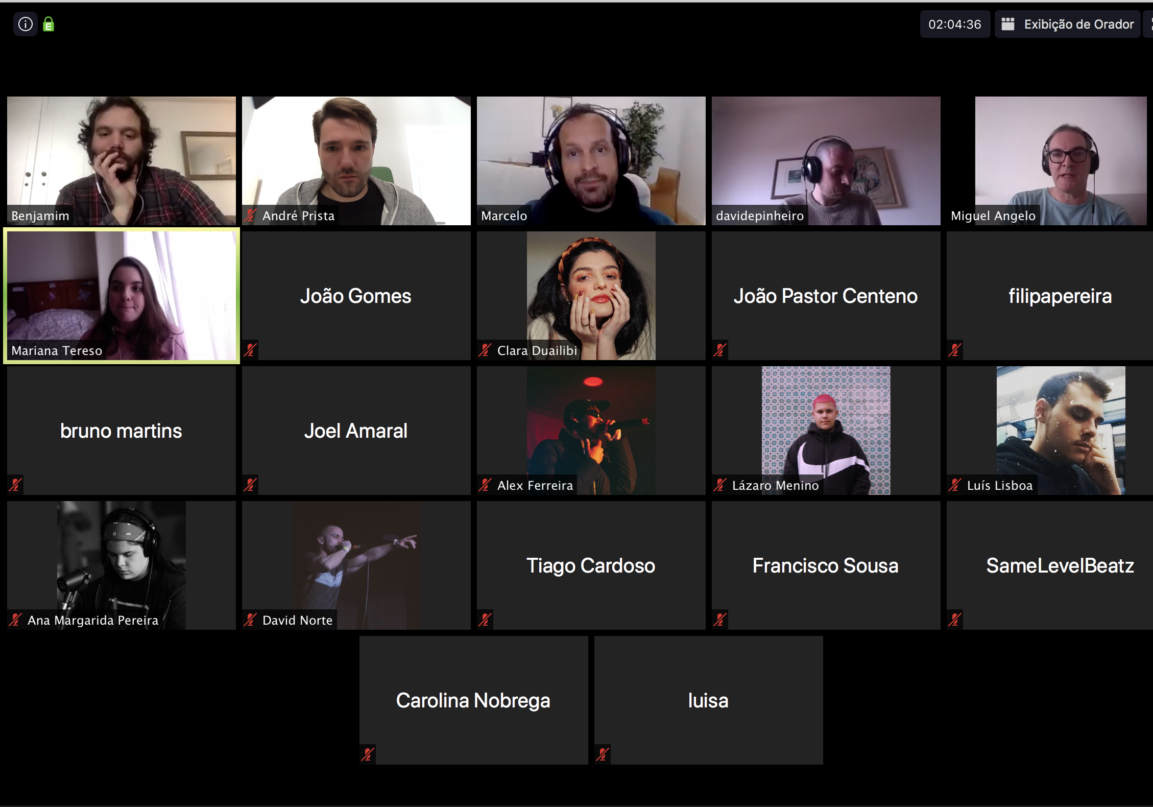 species. Even the DJ’s cat showed up on camera, maybe as a sign of “good luck!” (the session happened through Zoom platform). Marcelo Frota (Momo) gave a lot of composition tips and loved some voices.