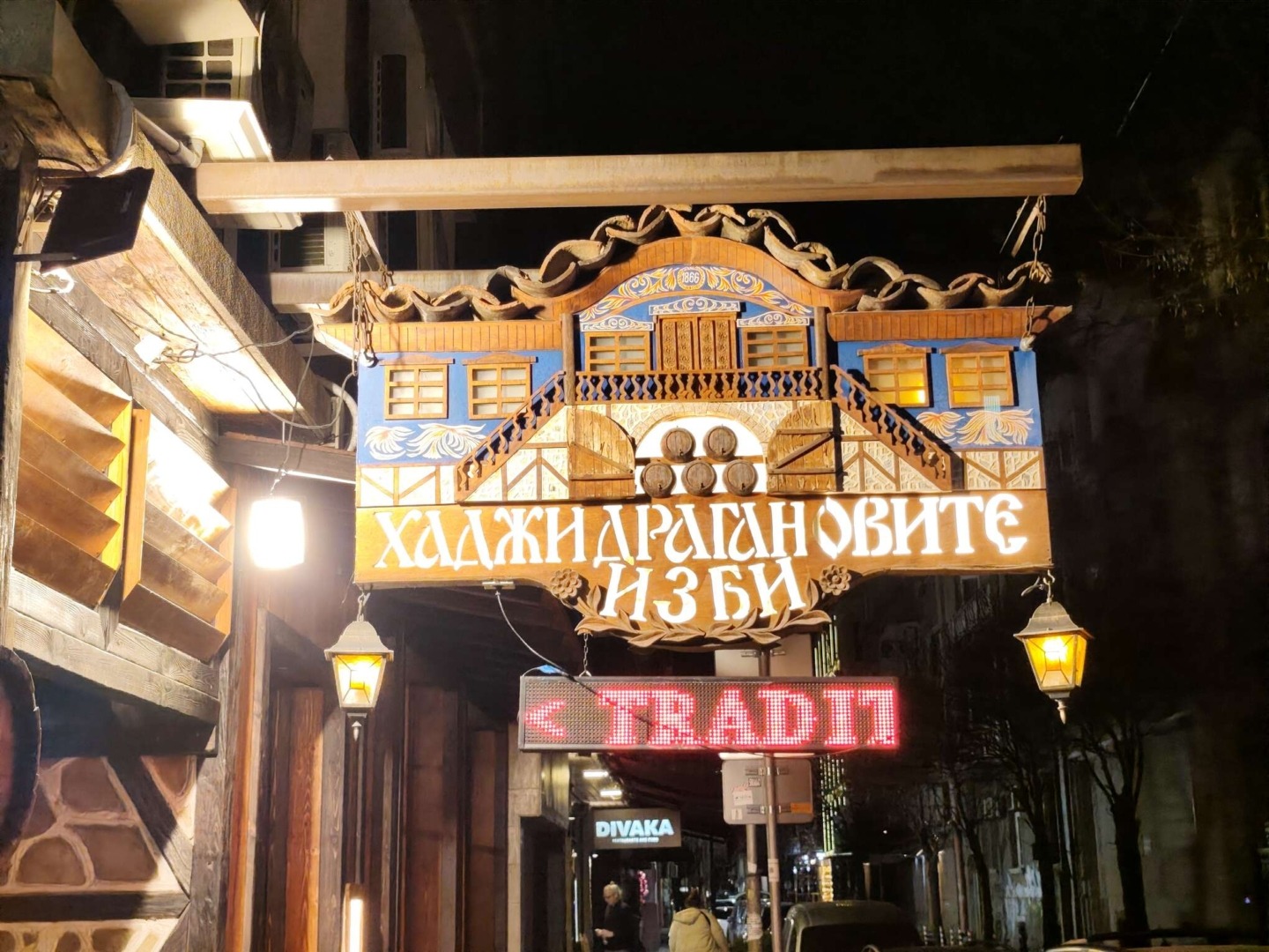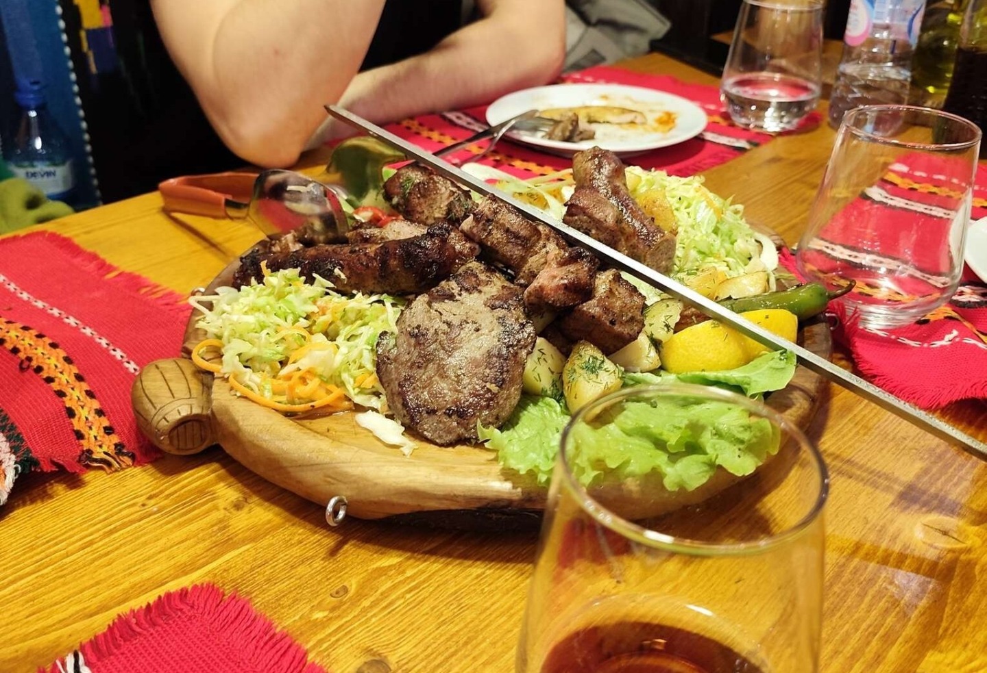 Noutra noite, passeámos com outra colega pelas ruas de Sófia à procura de um sítio para jantar e acabámos por ir ao Hadjidraganov’s Cellars, um restaurante tradicional búlgaro com um interior de madeira rústico muito único, com barris pelas paredes e um ambiente acolhedor. Partilhámos uma grande travessa com vários tipos de carne e provámos parlenka, um pão achatado com alho saboroso, enquanto ouvíamos música folclórica ao vivo.