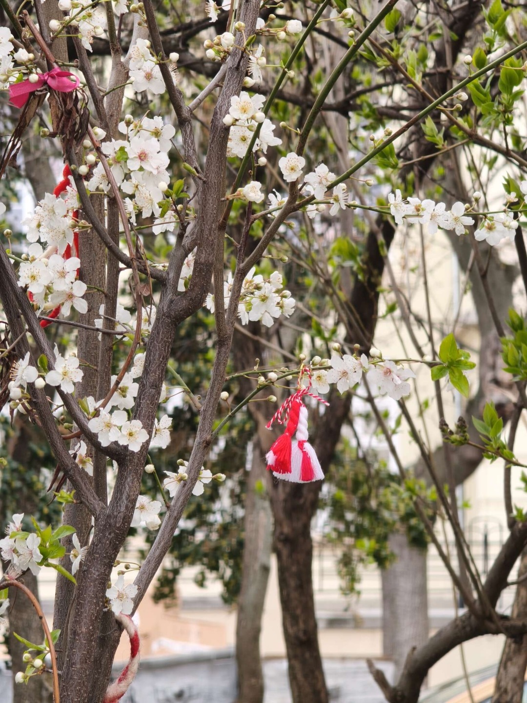 Com a chegada da primavera, as árvores estão a começar a florir e vejo muitas vezes pulseiras de Martenitsa penduradas nos ramos, o que é um detalhe cultural bonito e único.